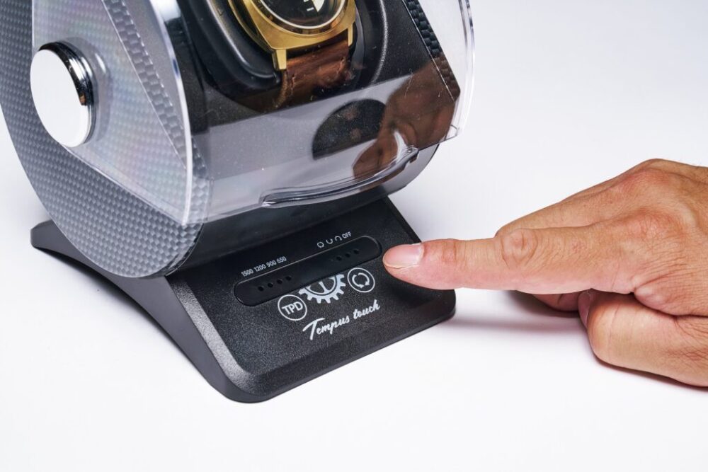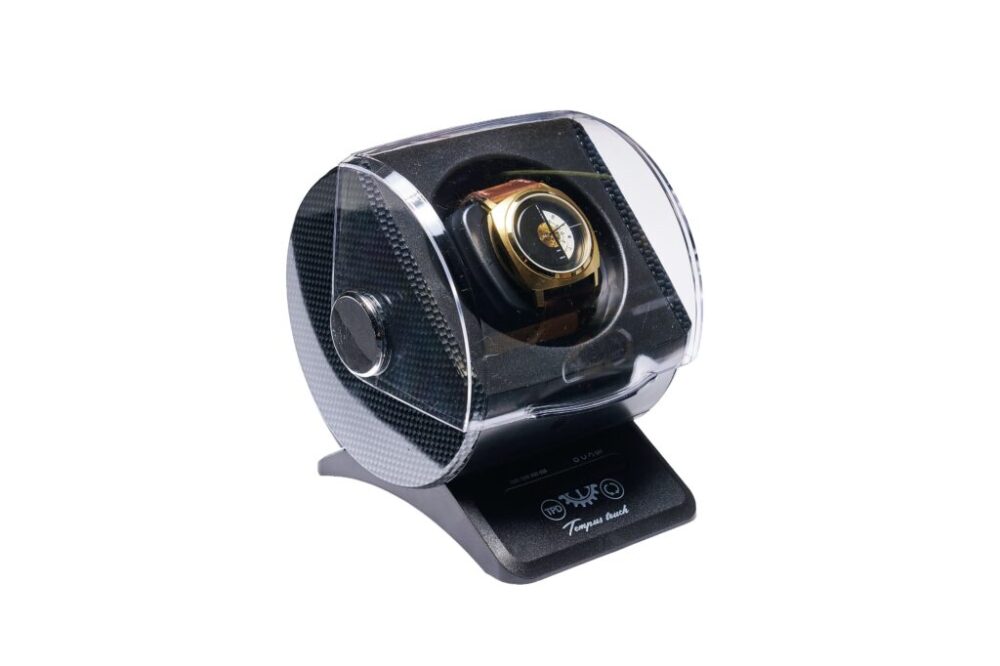 ケースに入れた状態でゼンマイを巻いてくれるワインディングマシーン。ブラックカーボン柄のデザインで、静音性・安定性が高く、就寝中でもまったく気にならない。タッチパネルの操作も◎。7700円(五十君商店 TEL050-5509-8423 https://er-watchrepair.shop-pro.jp)