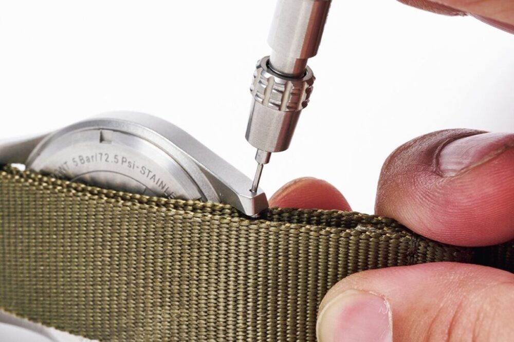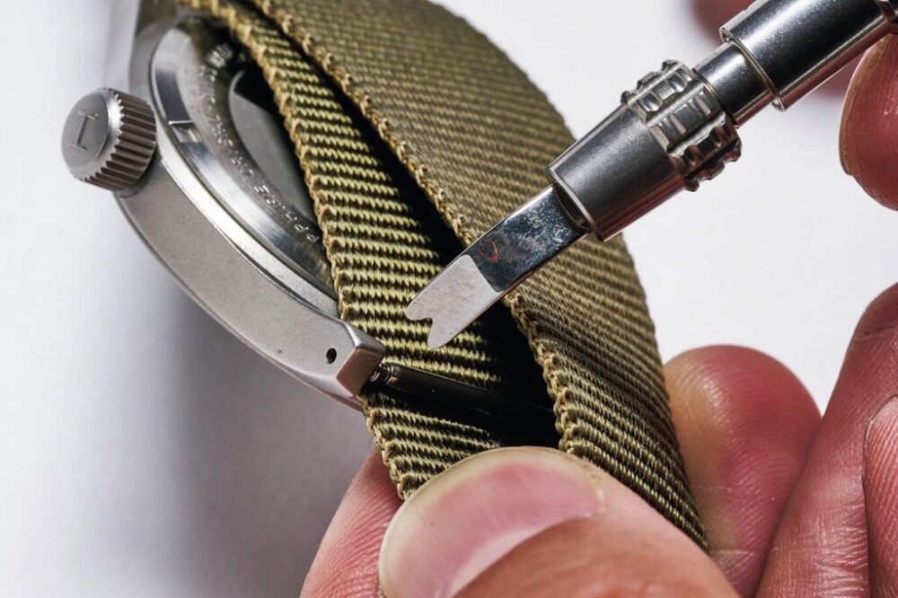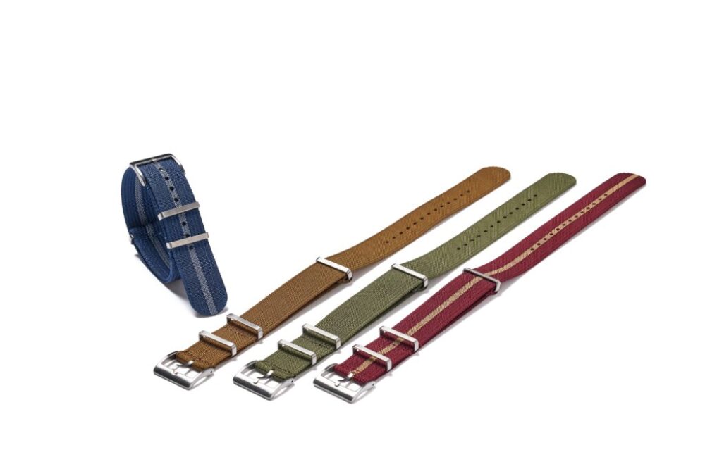 リブ編みされたような表情がとこか懐かしく、正規版のNATOベルトともレプリカとも異なる風合いに仕上がっている。バックルも生地に合うようにヘアライン仕上げに。コシがあり少し重めの時計でもずれにくい。各2860円(クロノワールド jpn@chronoworld.jp)