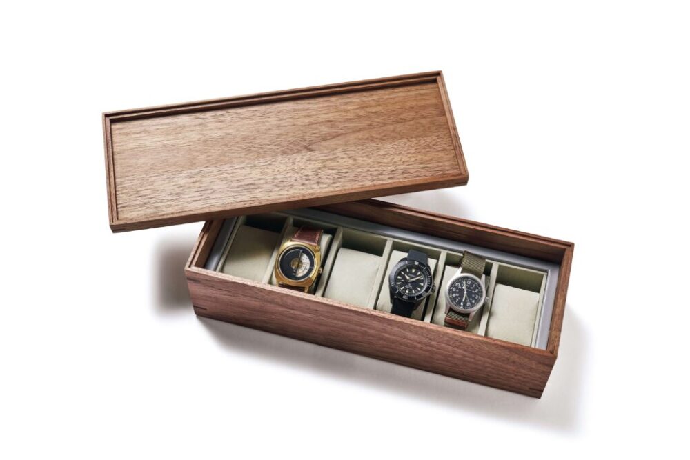 家具職人が製作したウォルナット材の時計ケース。すっきりとしたデザインに、ベロアの仕切りと高級感を醸し出している。スタッキングも可能なので、場所もとらずスマートに使えるのもポイント。2万4640円(伝統工芸(株)