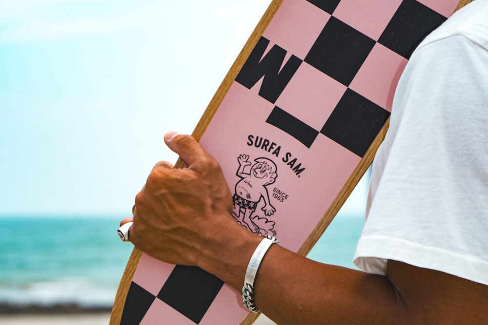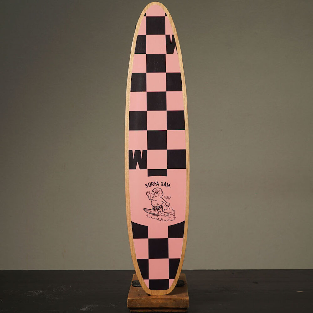 SURFA SAMのマスコットであるSAMをチェッカーフラッグ柄を組み合わせたグラフィックが特徴的なデッキ。ベースになるデッキは1965年に発表されたデッキ「LANDSURFA」のシェイプを忠実に再現し、現代の技術を融合させている。タスマニアン・オーク製。7万4800円