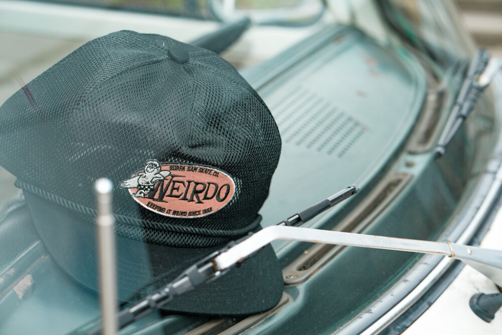 WEIRDOのロゴとSAMを組み合わせたこのコラボレーションならではのグラフィックをクラシカルな刺繍ワッペンに。これをトラッカーキャップのアクセントとして採用することで、スペシャル感もたっぷり。キャップはオールメッシュ仕様でビーチからの心地良い風を感じることができる。1万1000円