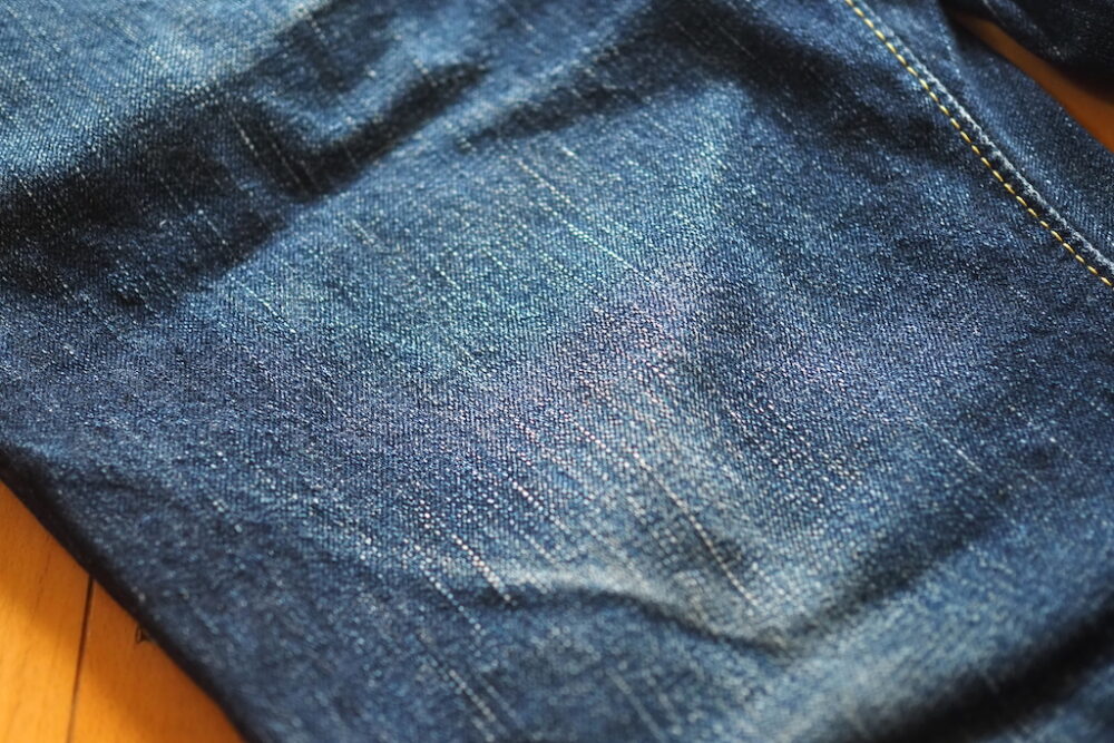シルエットはクラシカルなスタイルをイメージしたゆったりとしたストレートなので、バリバリのヒゲは出ないと思うけど、生地の凹凸が激しいスラブ感のあるデニムはピュアブルージャパンならではの色落ちが期待できる。