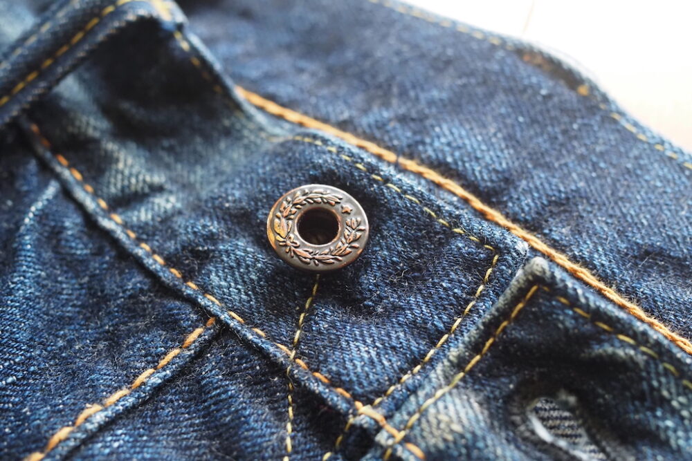 普段ベルトのバックルがこすれるせいか、フロントのトップボタンは表面の塗装が剥げ落ちて銅の地色が見えてきた。生地だけでなく、金属パーツも経年変化するところはさすが。普段見えない部分だけど個人的にはカッコよくなったと自画自賛。