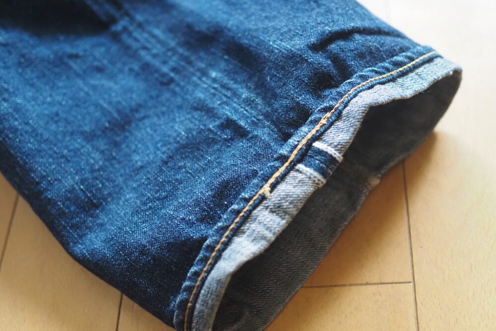 サイドのアウトシームにははっきりとセルビッジによるアタリが出現。波打つような濃淡と、セルビッジの両サイドに沿ってタテにできる色落ちはまさにヴィンテージデニムの雰囲気。ヴィンテージライクな風合いはセルビッジデニムにかぎる。