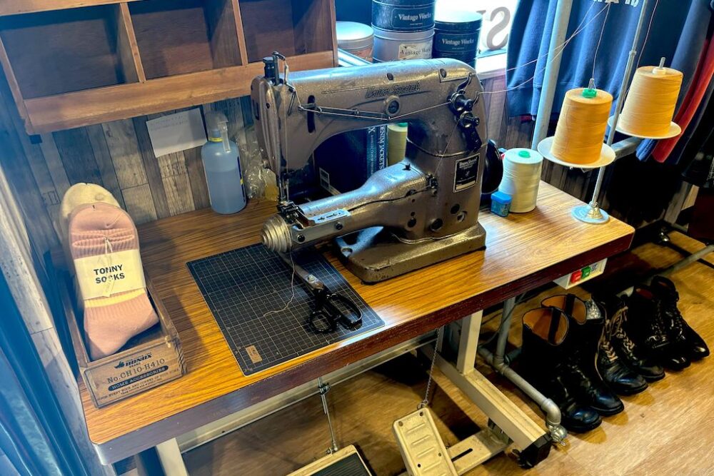 ジーンズの裾上げはアメリカのユニオンスペシャルのチェーンステッチミシンで仕上げてくれる。チェーンステッチで仕上げた裾は独特なパッカリングが生まれるため、デニムの色落ちにこだわる人には大事な要素である。