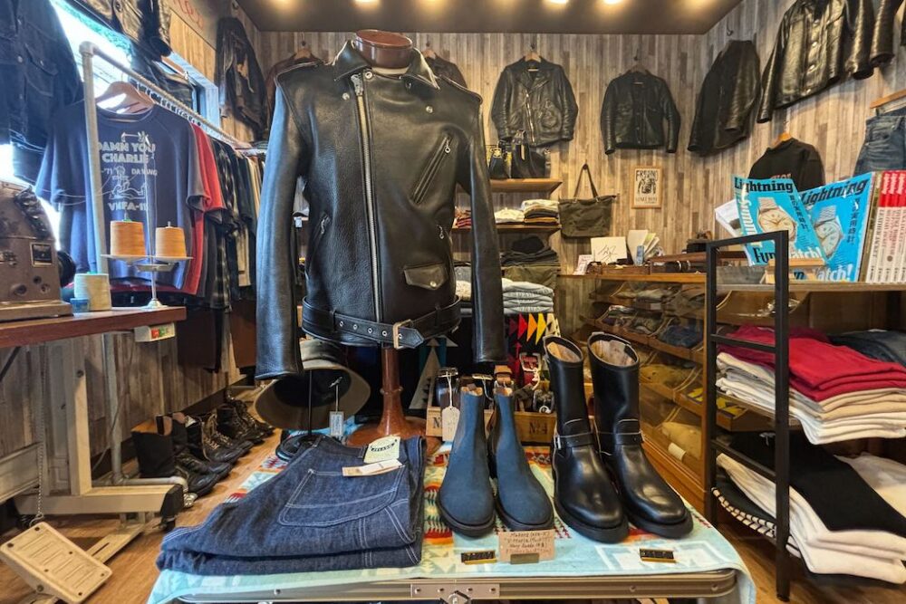 デニム、レザージャケット、ブーツなど長く愛せるアイテムを中心にセレクト。それぞれ経年変化が楽しめるプロダクツなので、じっくりと着用してそのエイジングを楽しみたい。壁には矢澤さんが育てたレザージャケットが並ぶ。