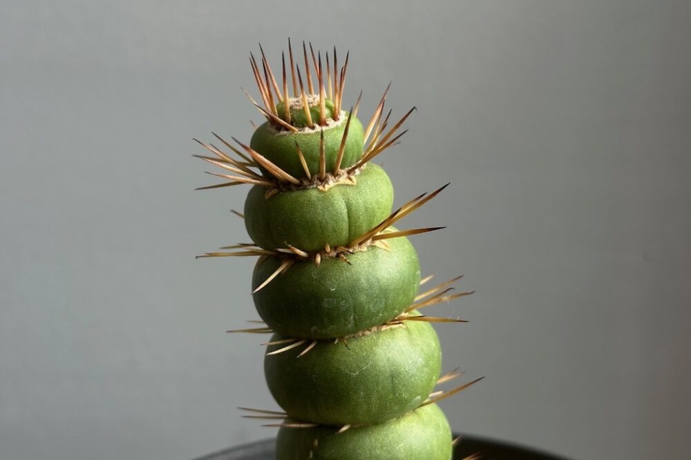 草団子を重ねたような不思議な株姿は、他のサボテンにはない一種独特な雰囲気があります。重なった草団子の隙間から棘が突き出たような姿は、まるで誰かの手で人工的に作られたのではないかと目を疑うほど奇妙で独特です。