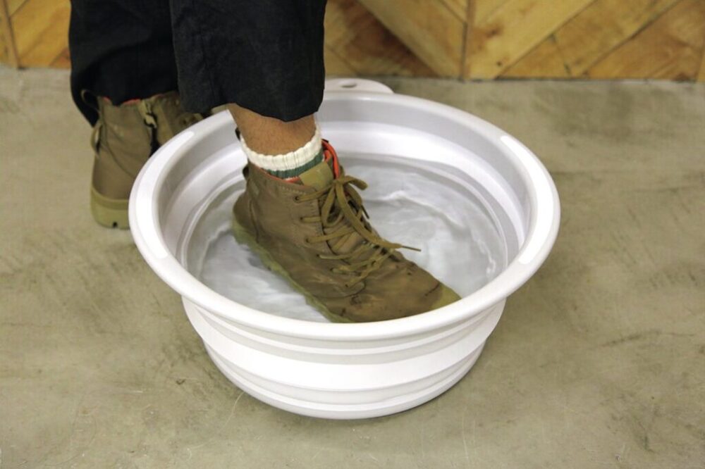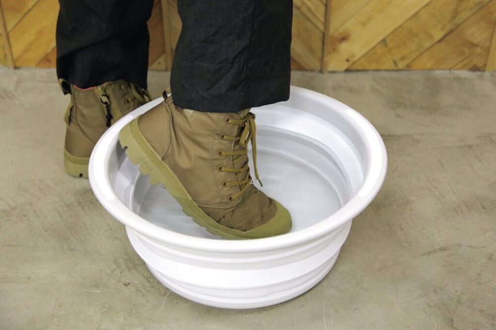 タライに水を張り、躊躇なく足を浸け約1分間その状態をキープする。さすがに少しは水は入ってくるだろうという予想とは裏腹に全く浸水がなかった。おそらくここまで浸水しやすい状況は、普段の生活やキャンプにおいて存在しないだろう。そんな実験を耐えたモデルと防水透湿性能の変わらない新しいモデル、その機能性は間違いない。