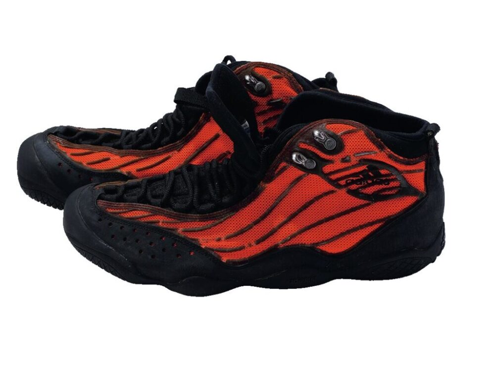 湿地で活動しやすいフェルトソールを採用した2000年代のアウトドアスニーカー。オレンジナイロンとブラックの組み合わせがかっこいい。サイズ 10。1万2980円(カメレオン ウェア ハウス TEL03-3478-4778)