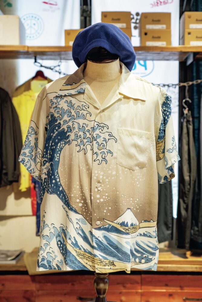 日本が世界に誇る偉大な絵師たちに焦点を当て、アロハシャツというキャンバスに巨匠たちの作品を再現した「日本の意匠」シリーズにおける象徴的な作品。葛飾北斎が71歳から描き始めた全46図の「富嶽三十六景」は、当時の富士山信仰とも相まって大ヒットした。その中でも最も有名な作品が、1831年の神奈川沖浪裏である。北斎は、波を描く染料に藍を使っており、青の濃い部分には強いこだわりを持っていた。当時はまだ入手困難であった輸入顔料の「ベロ藍」をわざわざ使っていたことが、そのこだわりを証明している。当アロハシャツには、北斎が使っていたものに近い藍顔料を採用し、その妥協なき姿勢を継承している。3万5200円