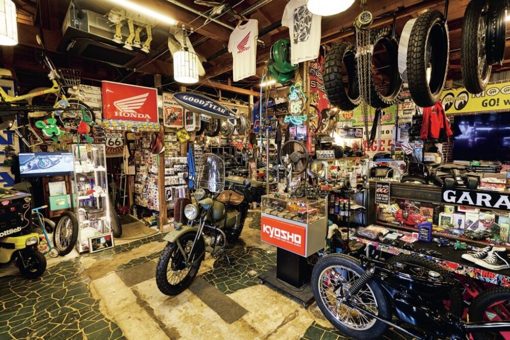 カスタムカブにも、店づくりにも映画美術の経験が紐づく。ヤレたヴィンテージ加工を塗装で表現するのは小道具づくりで培った。2020年から完全に独立してつくった今の店舗。プラモや玩具で溢れさせた店内は、実はカベのチープさをごまかすためでもある。セットづくりの知見を使った。