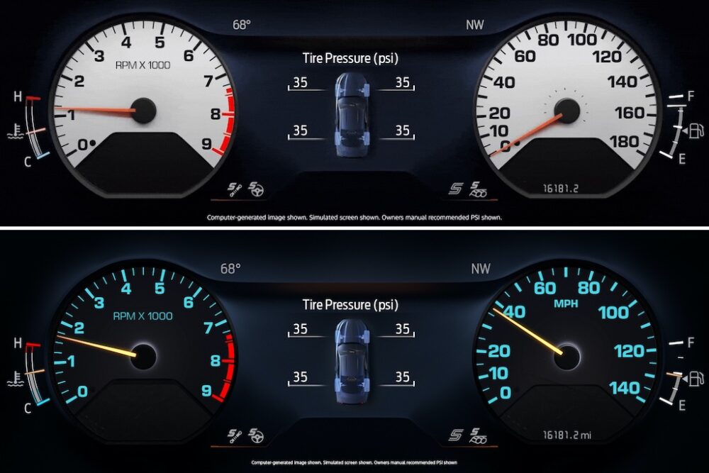 ブリタニー・ブルーの記念モデルと同時に発表されたのが新たなメーターデザイン。昼間はホワイト、夜はバックライトによってアイシー・ブルーに輝くデザインにアップデートされた。このデザインは1999年から2001年に存在したマスタングSVTコブラをオマージュしたものとなっている。コンピュータのアップデートで2025年式マスタングにディーラーでインストールが可能だという。