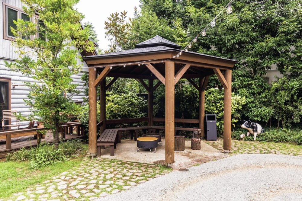 敷地内には木陰にベンチを備えた東屋があり、多くの木々に囲まれてゆっくり過ごすことができるようになっている。