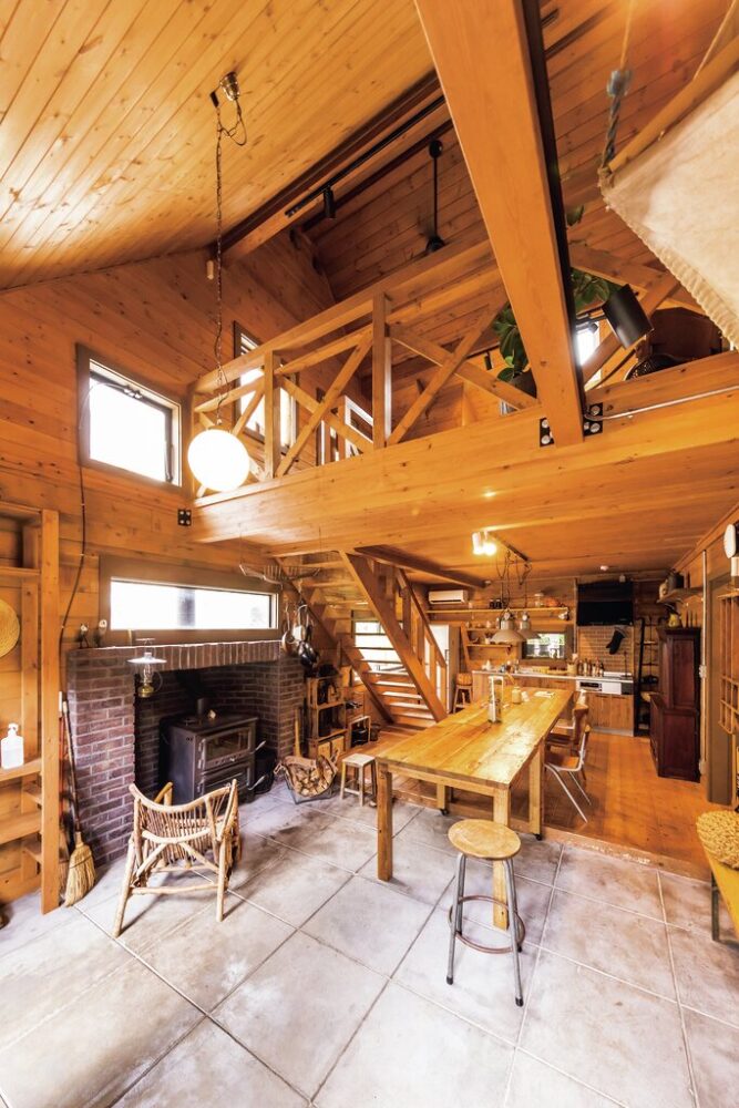 カントリーログの一番の魅力は、何と言っても天井まで吹き抜けとなっている開放的な土間スペース! 土間だからDIY作業をしてもいいし、バイクを入れることだって可能。とにかくユーザーの使いたいように使えるスペースなのだ。ちなみに二階に上がっても土間スペースは吹き抜けとなっていて見渡せるので、必然的に土間が家族の集まる生活の中心となる作りとなっている。