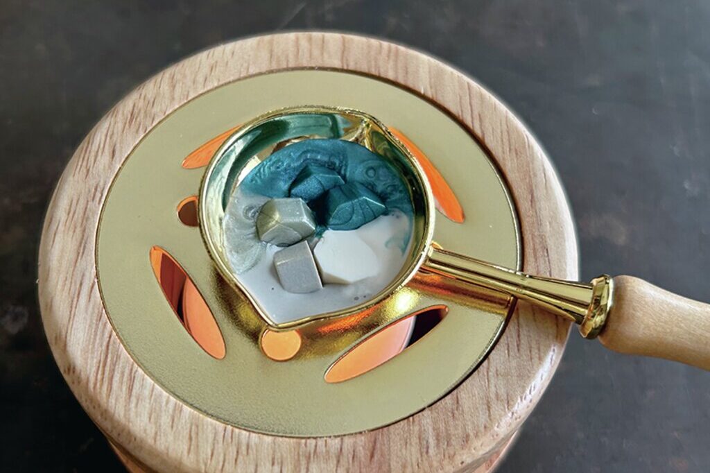 シーリングワックスは日本語で封蝋といわれ、その字のごとく、溶かした蝋で封をする道具。文具編集部にいたときに初めて使ってみたのだが、当時はまだそれほど種類もなく、蝋は長さ10㎝くらいの棒状のものが一般的。キャンドルの火に蝋を直接当てて、少しずつ封筒に蝋を垂らしていた記憶がある。