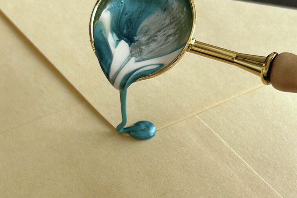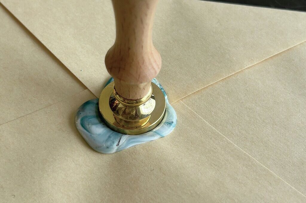 ワックスを垂らし終わって、一息ついてからまっすぐ上からスタンプを捺す。まだワックスがゆるい状態なので、そのまま待つ。