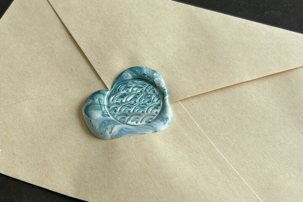 ワックスが冷えて固まり始めたら、スタンプを静かに外す。ワックスを多めに垂らしたためか、いびつなカタチになってしまった(苦笑)。