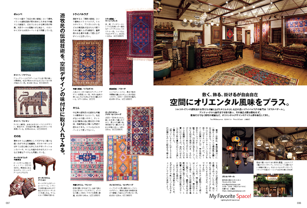 こだわりの空間を演出する際にアクセントとなるのが、トルコやイランの遊牧民の女性たちが織り上げたキリムや、少し毛足の長いトライバルラグなどの敷物。このオリエンタルデザインのアイテムを1枚置くだけで、空間の印象がガラリと変わるのも面白い!