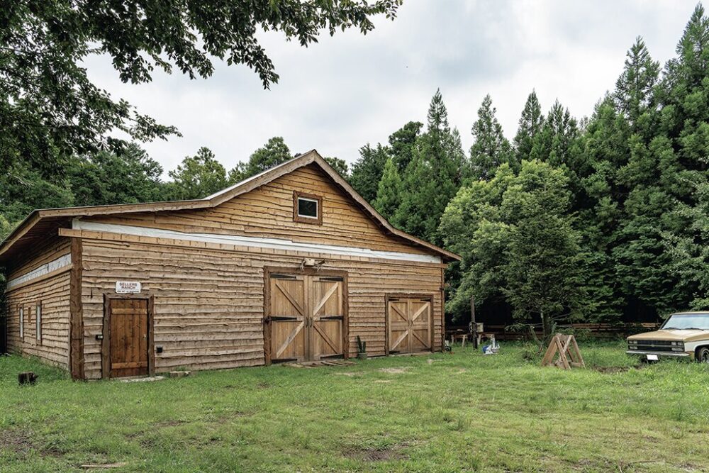 西部開拓時代の馬小屋をイメージした巨大な木造ガレージ。当時の手法をモチーフに、あえて不揃いな木を重ねた外観がクラシカルな雰囲気。