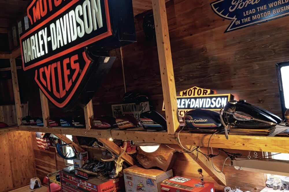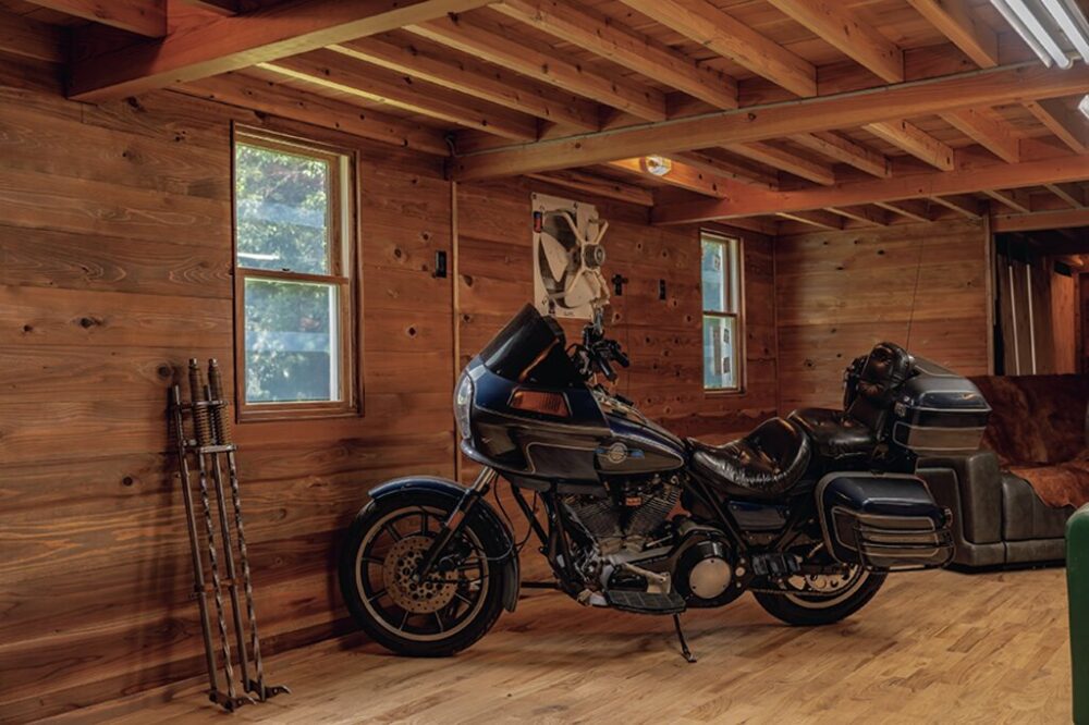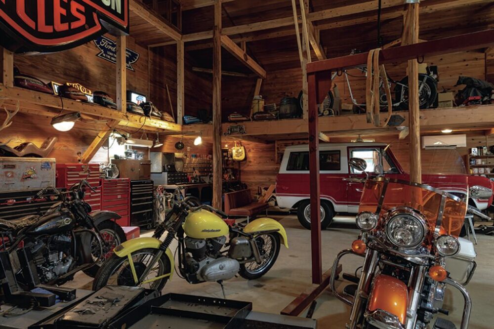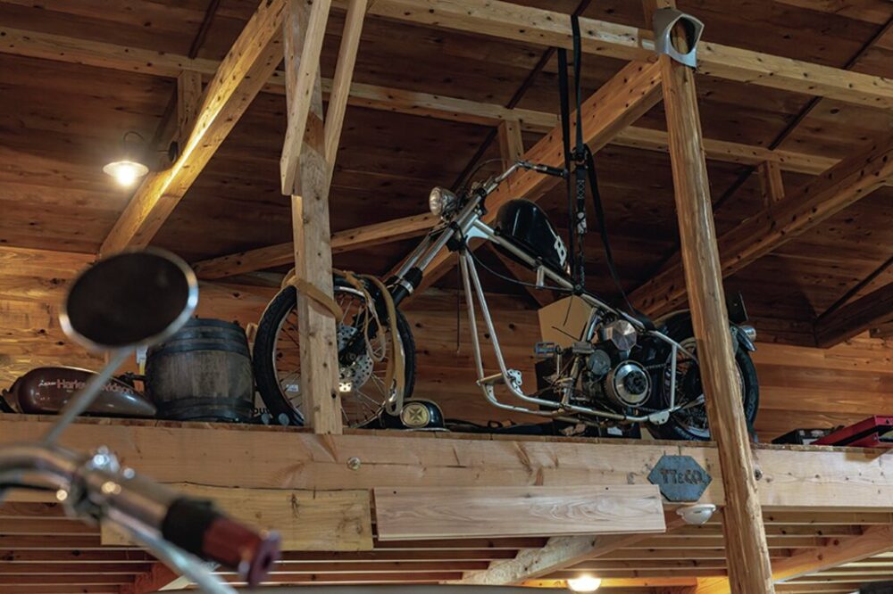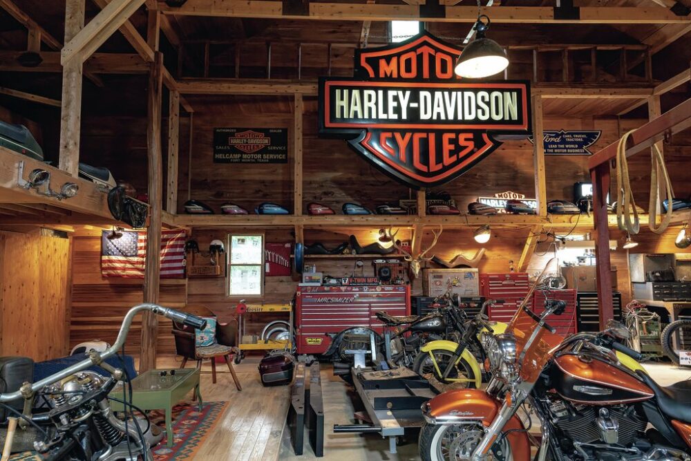 中央の通路を挟んで両脇に中二階を設置。バイクはM8ハイウェイキングやKモデル、製作中のナックルヘッド、FXRTなど、新旧入り混じる様々な年代のハーレーを所有している。