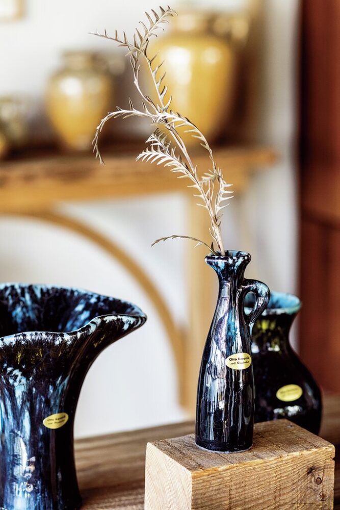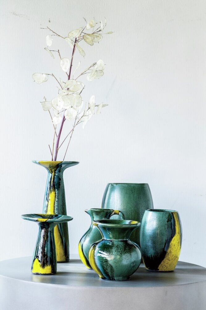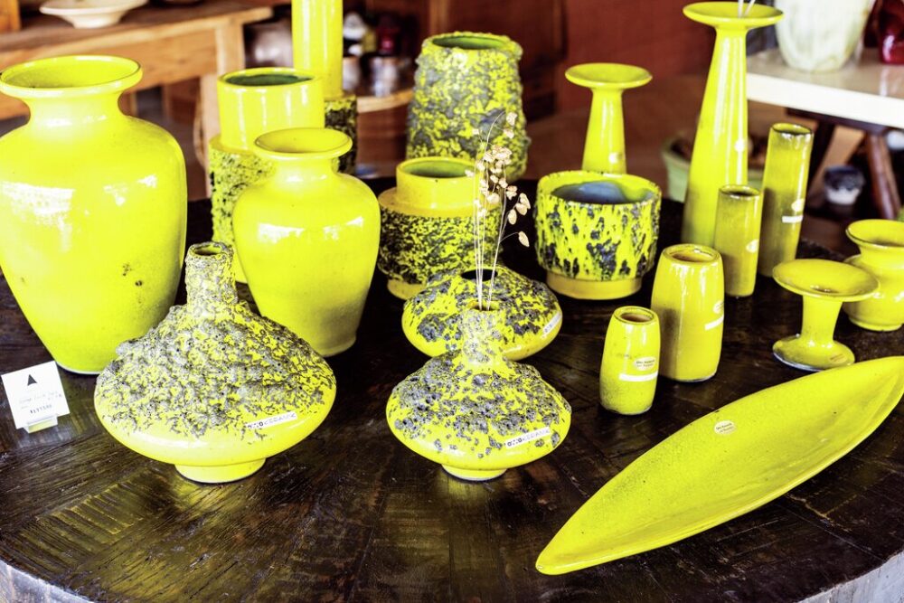 このようにどこかサイケデリックな’70sのテイストを感じるようなカラーリングも展開されている。同じ釉薬でも一輪挿しから食器までバリエーションがある。