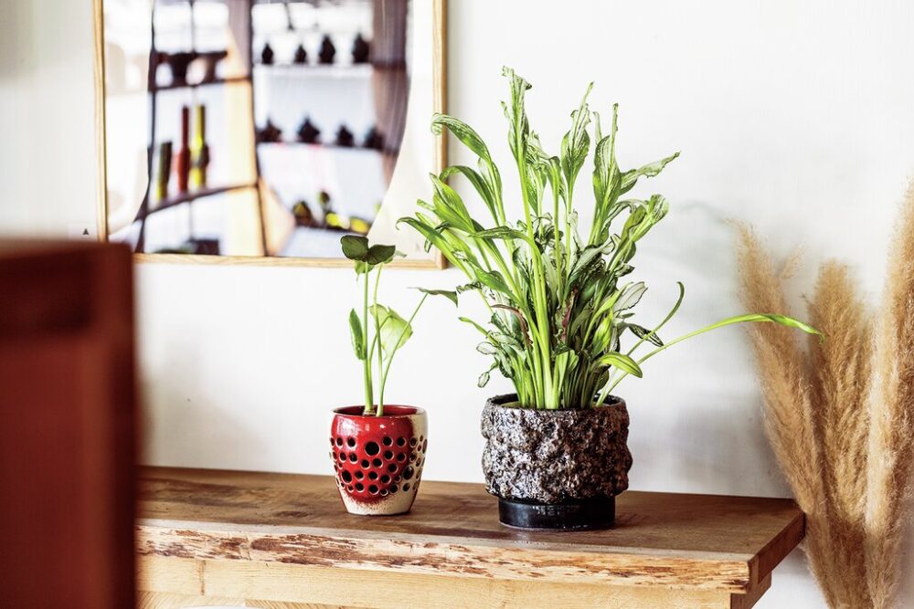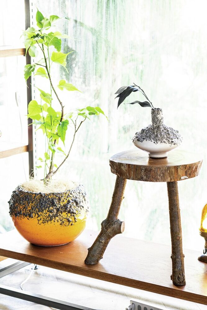 部屋の雰囲気をガラリと変えるプランターケースは、人気モデル。右はファットラバらしい溶岩のような風合いが魅力。左はミッドセンチュリーモダンな印象。右/1万3800円、左/5800円。