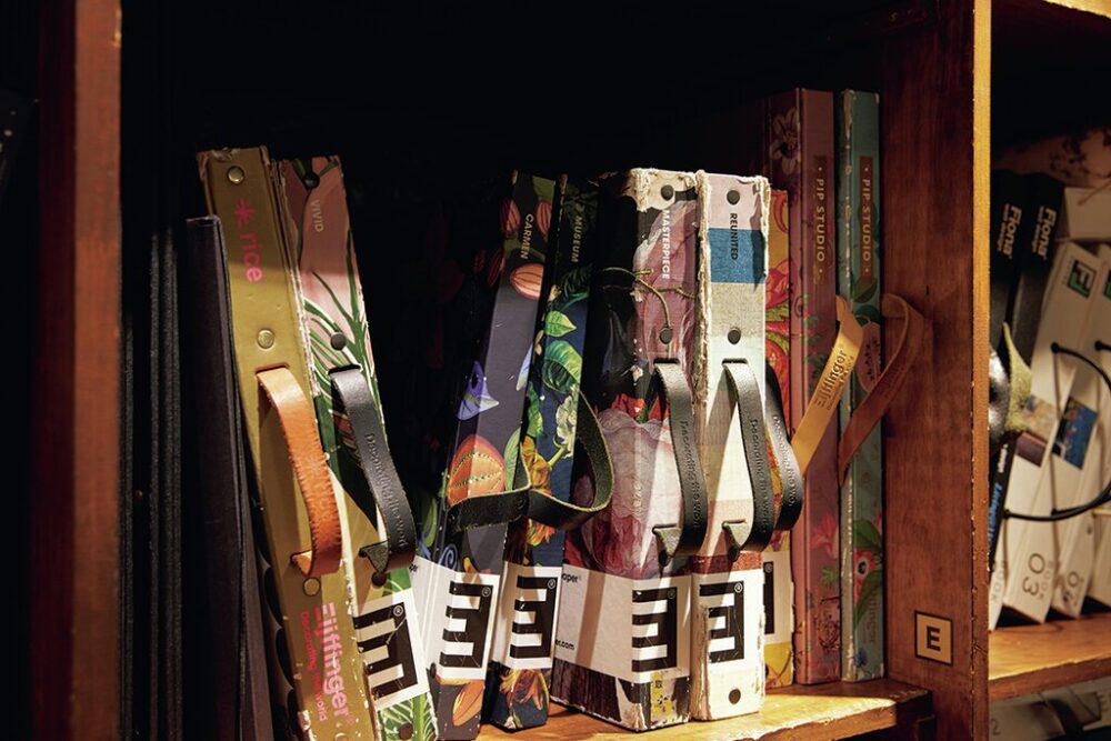 15カ国150ブランドの壁紙を扱うWALPA。見本帳は1冊がとても分厚いため取り出すいよう革製のハンドルを付けている。装丁もとてもおしゃれ。隅々までじっくり眺めたい。