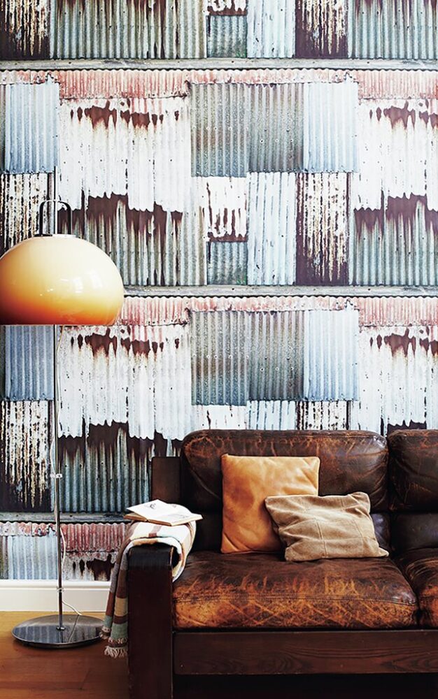 英国のデザイナー、エラ・ドラン作。色違いのトタンを組み合わせたインダルトリアル系のデザインで錆びた雰囲気など忠実に描かれている。光を浴びたときの見え方まで計算されているとか。1ロール3万6850円(輸入品のため為替の変動により価格改定があります)。