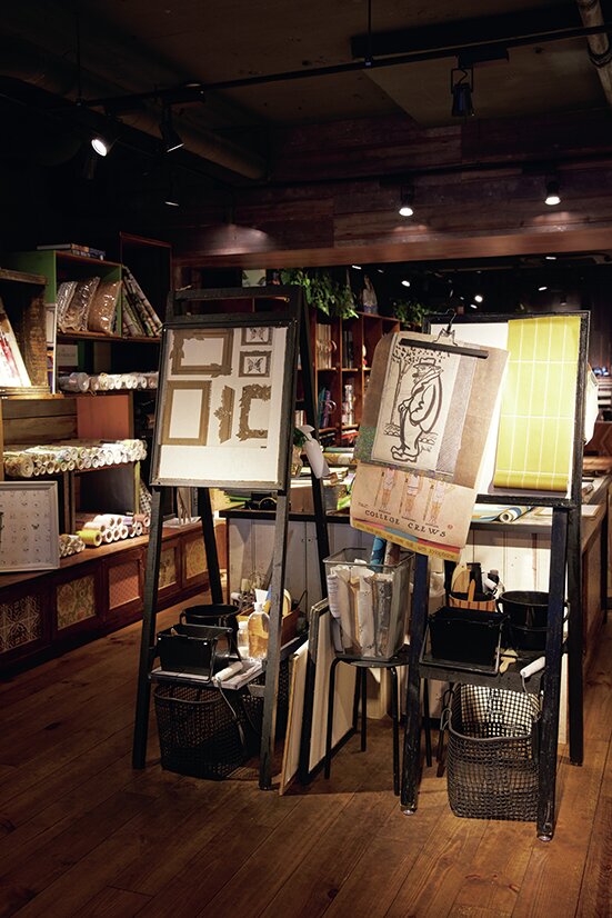 店内の壁やドア、テーブルに至るまで、ほぼすべて壁紙が使われている。右側は可動式のパネルで有名デザイナーなどが手がけた作品をサンプルとして展示。左側には海外の取り扱いのある壁紙の見本帳が棚いっぱいにある。こちらは注文して取り寄せるスタイル。