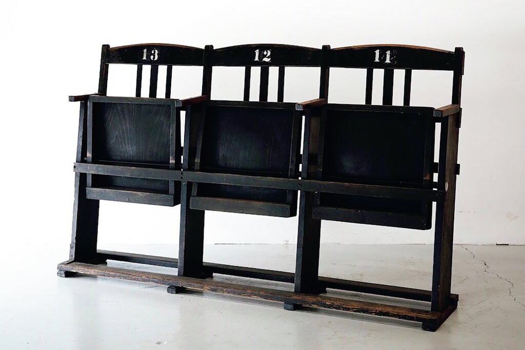 ヨーロッパから入荷した3連の木製シアターチェア。所々、塗装が剥がれ、木本来の色味が浮き出ていたり、シート番号が掠れている。時代経過を感じる、味のあるシアターチェアだ。折りたたみ可能なので、場所を取らない利点もある。7万4000円。