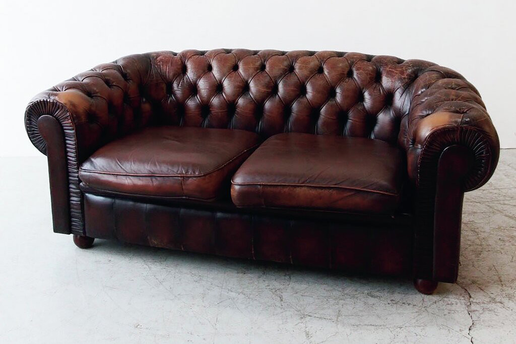 幅188㎝、奥行き104㎝、高さ78㎝、座面高44㎝の2人掛けソファ。経年変化した革の表情や佇まいは重厚感があり、存在感抜群。深く腰をかけて、ゆっくりとした時を過ごしたい。13万2000円