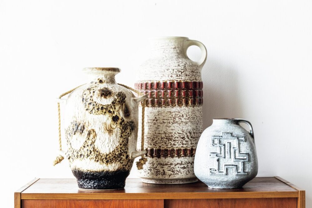 1950年代半ば〜’70年代半ばに流行した西ドイツ製の陶器「Fat Lava」と呼ばれる花瓶。「肥えた溶岩」という名の通り、溶岩のようなボコボコした表情はユニークで唯一無二。熱狂的なコレクターがいるほど人気が高い。左:2万900円 中央:2万7000円 右:2万3100円。