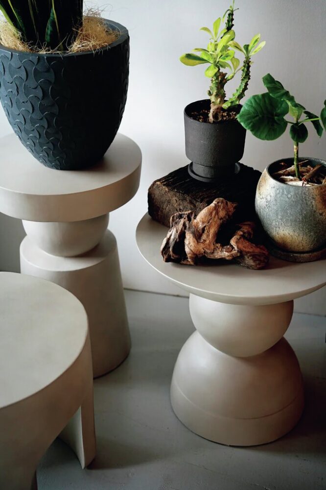 普遍的なデザインを基本概念に掲げたブランド、HOOKのサイドテーブル。ヤシの繊維材料を混ぜ込んだファイバーコンクリートを使用。亀裂発生を防ぎ、天候や湿度に強いので屋外でも安心。強度と実用性を兼ね備えている。左前:4万2800円 左奥:4万6200円 右:4万6200円。