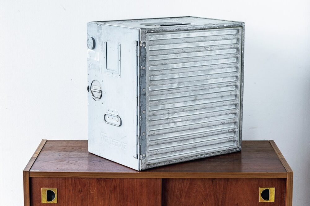 本来、飛行機の機内食の運搬や収納に使用されていた。ボディにはオランダの航空会社「トランサヴィア」と型押しされている。傷や凹み、アルミの風合いがヴィンテージならではの味が出ている。2万7500円