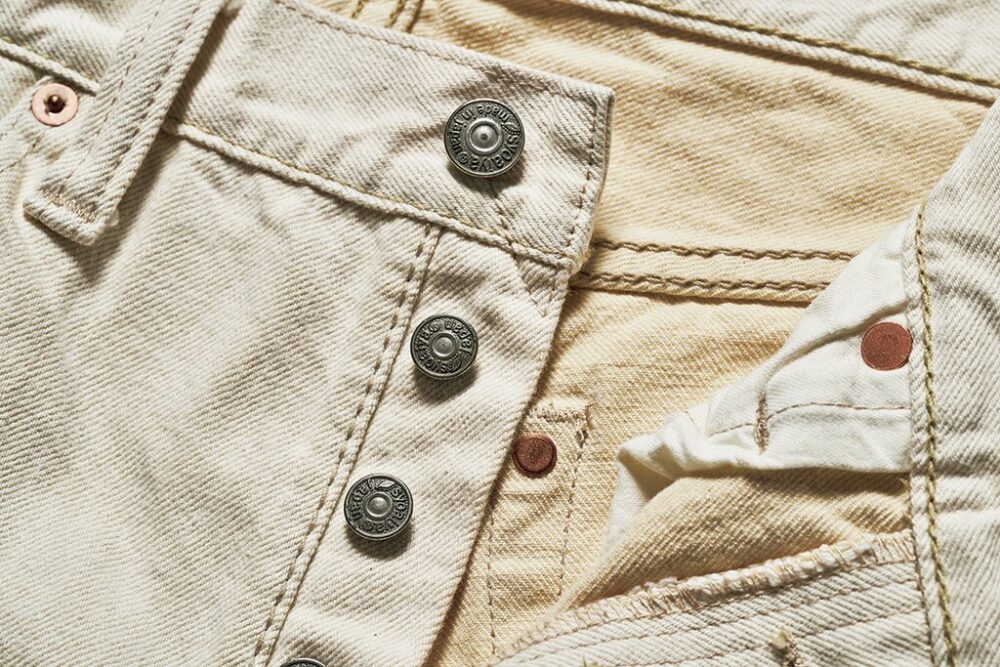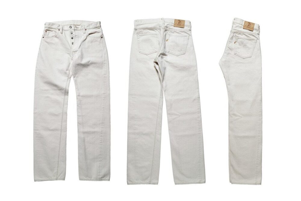 フロントはボタンフライ。他の定番モデルと基本仕様は同じだが、ステッチの色など、エクリュの優しい色合いに合わせている。