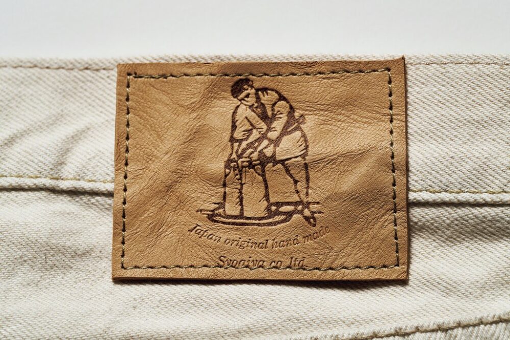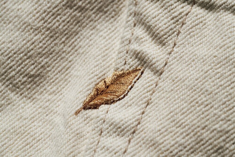 ピュアブルージャパンのアイデンティティであるリーフマークも、エクリュに合わせてシックなカラーに変更され、生地色や縫製糸とのバランスを取っている。