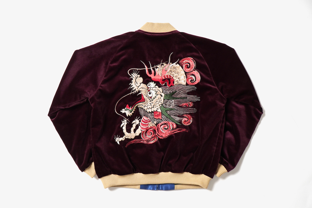 別珍側のA面はヴィンテージのスカジャンでも稀少なワインカラーをチョイス。背中、両胸に龍のみが入ったシンプルな図柄になっている。淡いゴールドの糸を駆使して表現される龍の鬣(たてがみ)やウロコ部分のディテールは秀逸。また、中綿+キルティングステッチという別珍モデルのスタンダードな仕様を省略することで、長いシーズン楽しめるジャケットになっている。9万7900円