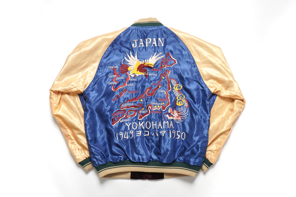 別珍側の龍だけでなく、B面には鷲、虎、龍、それに日本地図と、スカジャンの人気モチーフをすべて詰め込んだデザインは秀逸。