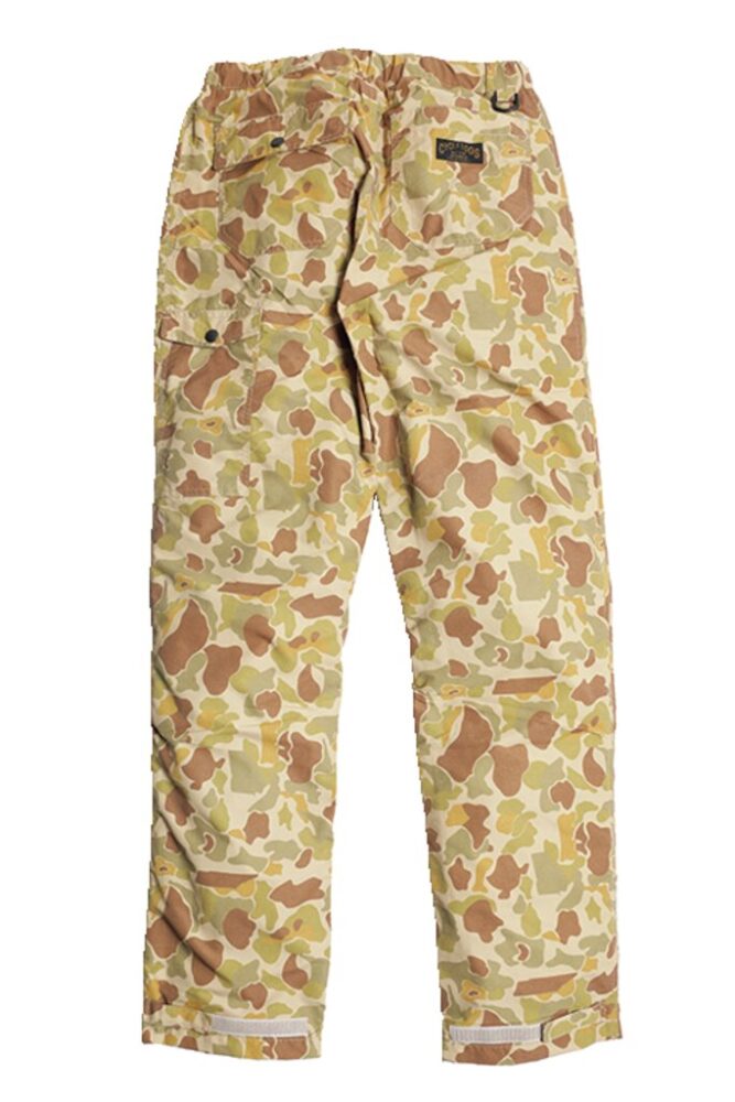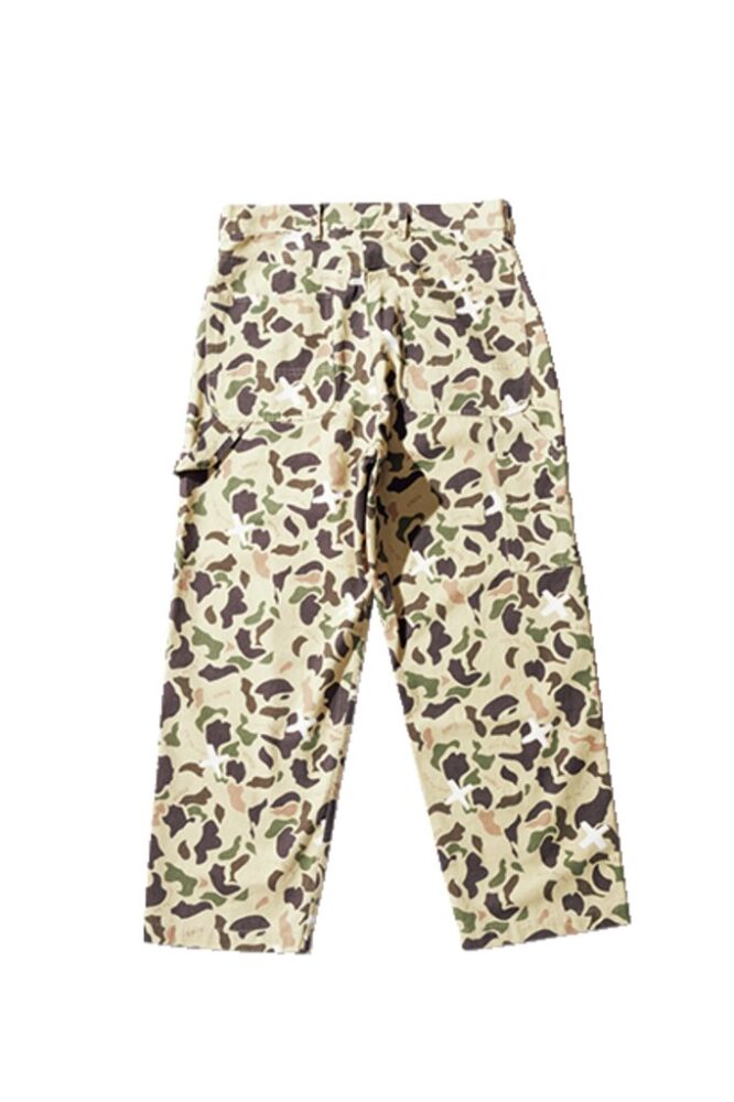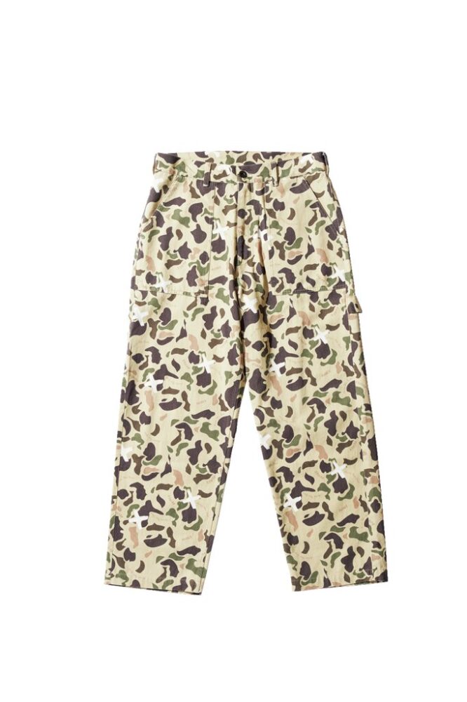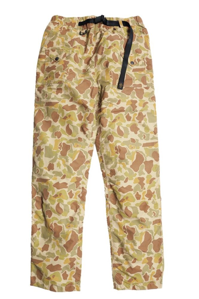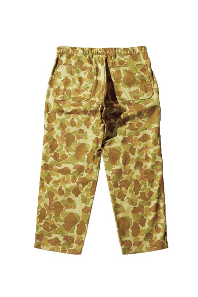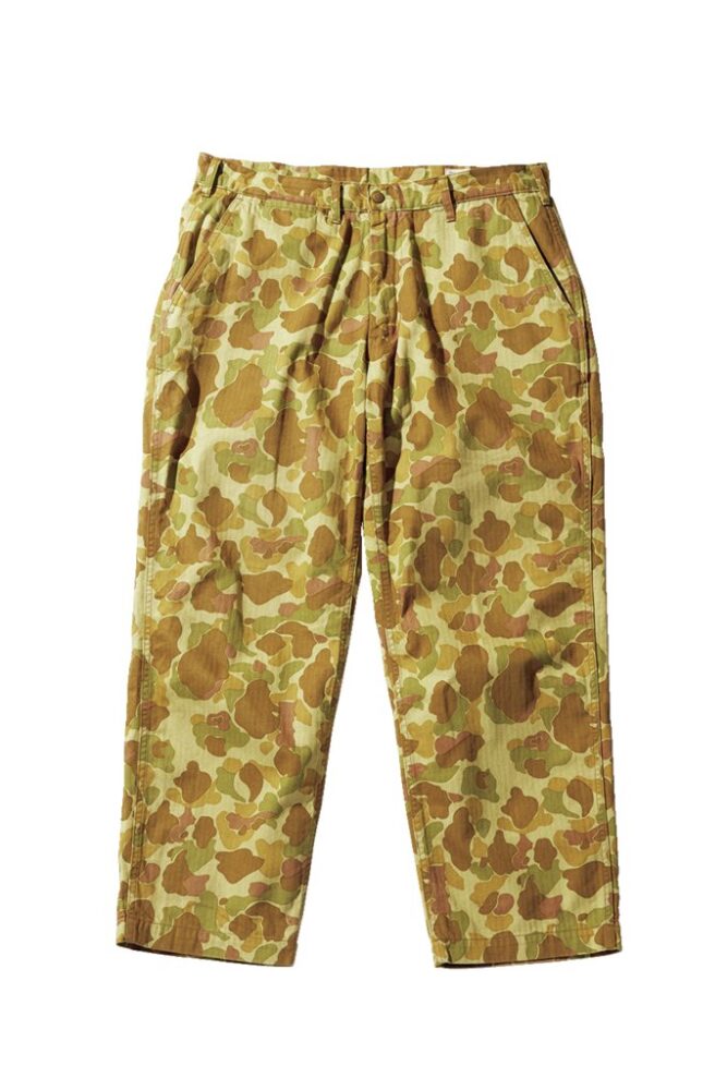 1940〜’50年代にアメリカ海兵隊を中心に採用されたダックハンターカモを裏表両面にプリントしたヘリンボーン生地を採用。ブランド定番のテーパードがかかったやや太めのストレートシルエットにサイドポケットのないシンプルなデザインで、汎用性の高さも魅力(サロン ボンクラ TEL072-968-7073)