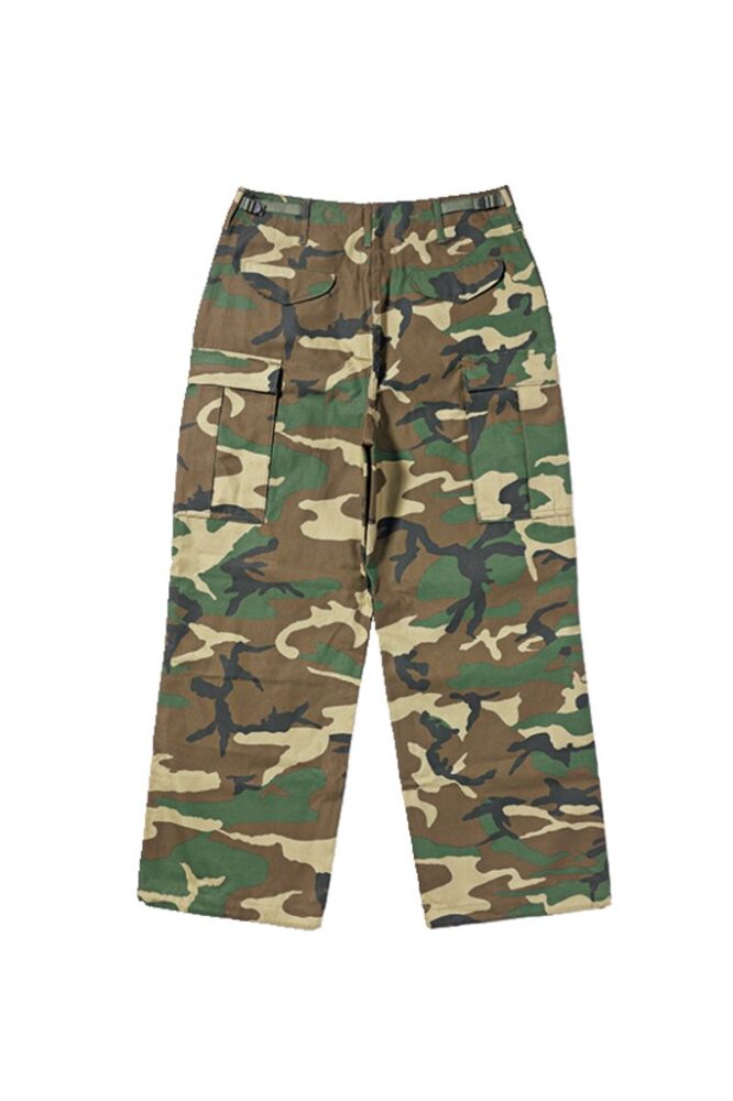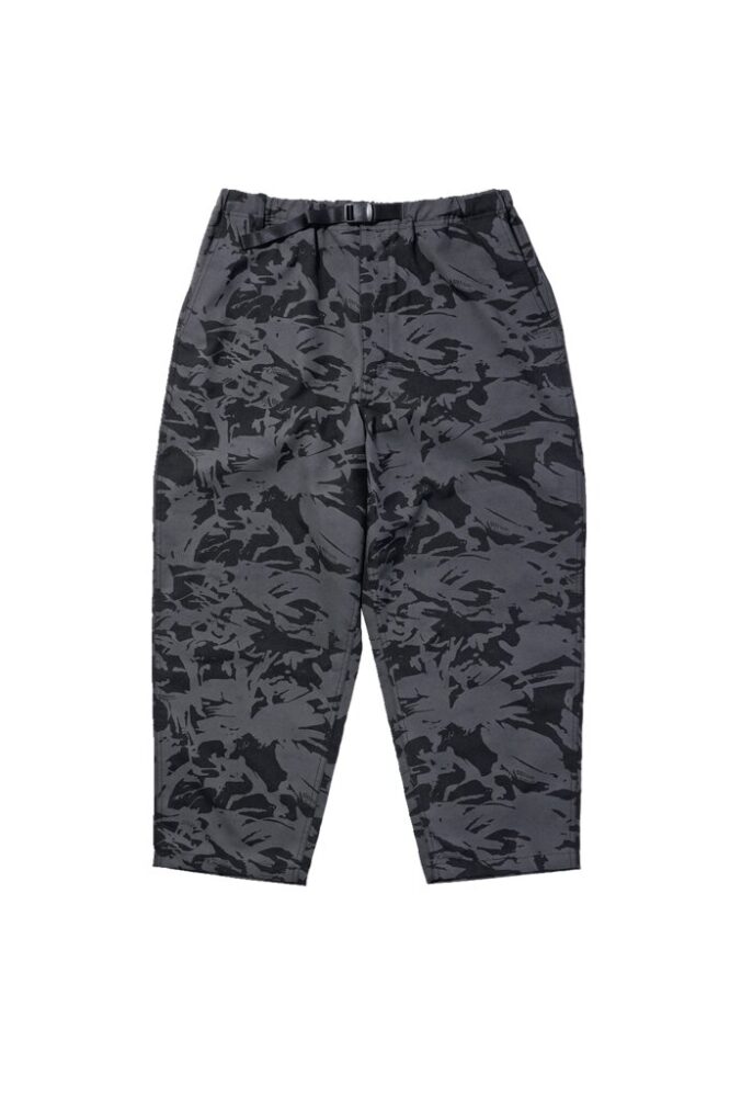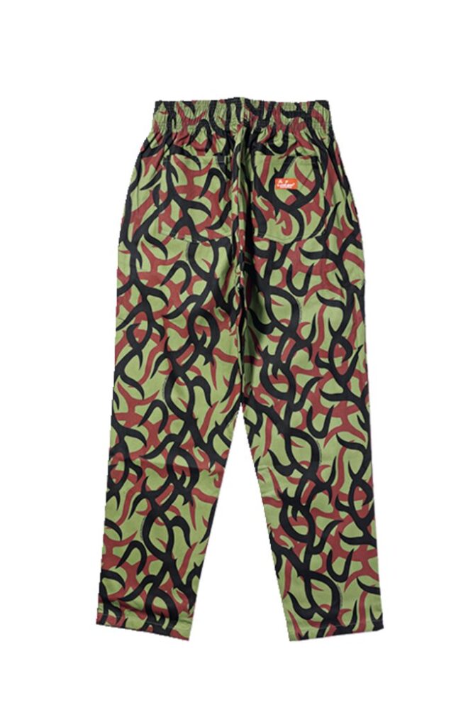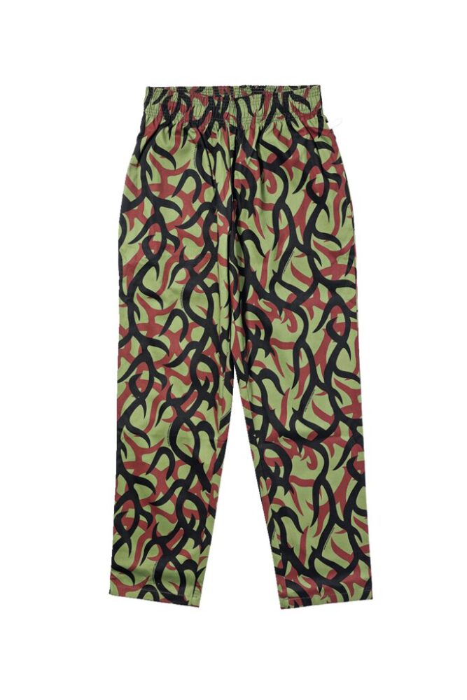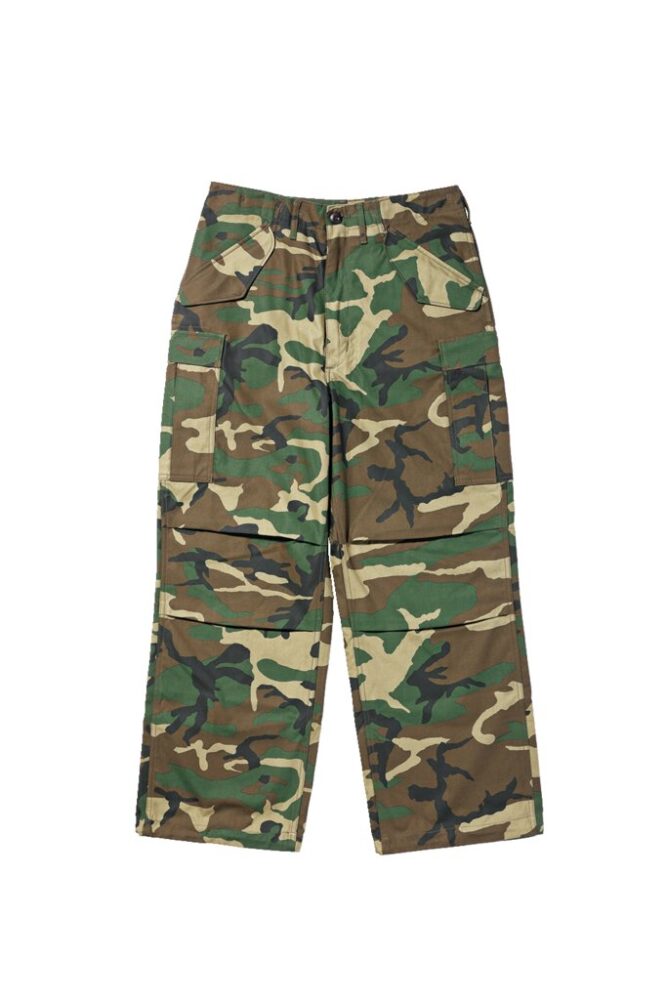 ウエストに配されたシャーリングゴムやドローコードが特徴のシェフパンツに、1990年代にアメリカ陸軍試作として開発されたものの不採用となったつる状のカモ柄を大胆にプリントした新作。定番のパターンではないからこそ、シンプルなスタイルに取り入れたい(バディーズ TEL03-5721-9951)