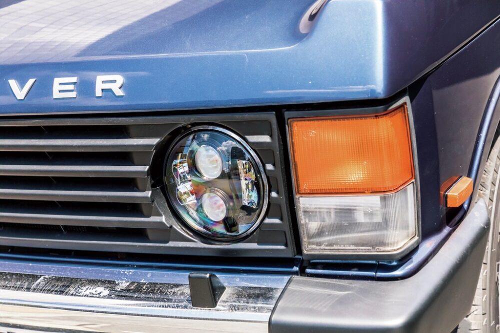 ボディ四隅に備わるスクエアな灯火はレンズ類も美しい状態。ヘッドライトは社外品に交換されている。
