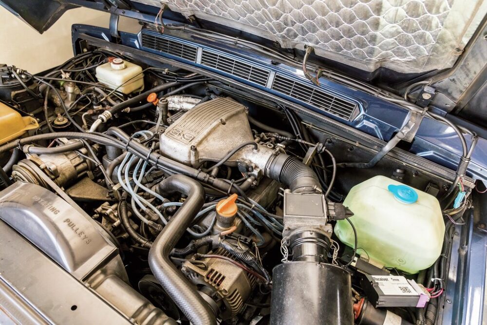 取材車両は`90年式で、履歴から過去に足回りのリフレッシュをしっかりと行なっていることが判っている個体。外装はプリマスブルーという濃いめのブルーメタリックで、外側は同色でペイントをリフレッシュ済み。グレーレザーとウッドパネルのコンビネーションとなる内装も、ダッシュは革張りでリフレッシュし、ブラックウォールナットのパネルに交換済みだが、レザーシートが若干傷んでいるので、リフレッシュがおすすめとのこと。