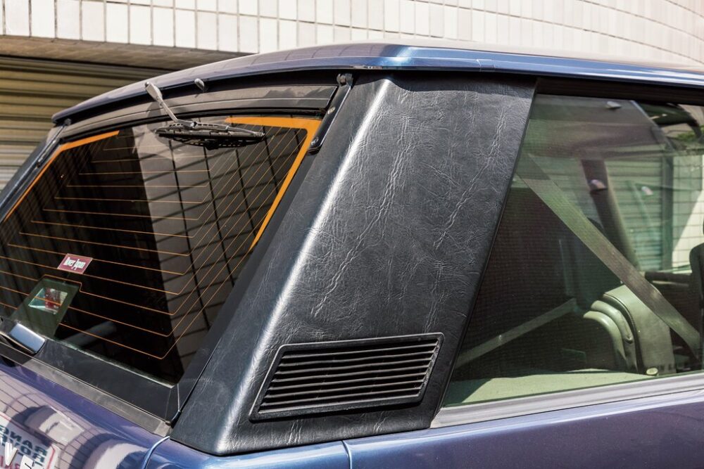濃いめのプリマスブルーではあまり目立たないが、ボディ後端のピラーはボディカラーに関係なく革張りとなるのが大きな特徴。