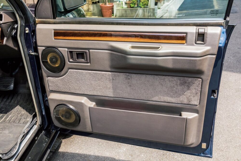 ドアパネルもグレーで統一されるほか、ウッドパネルが備わる高級感のある内装。ドアパネルにスピーカーを2つ装備しているあたりもラグジュアリーな仕様だ。