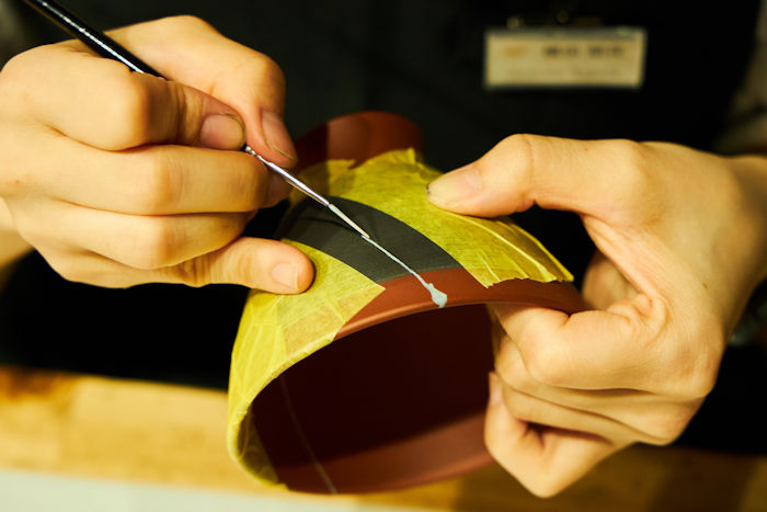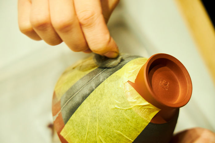 ①このごはん茶碗の場合、表面がザラザラしているため、凹凸の中に金粉が入りやすいのだそう。それを防ぐためにマスキングテープでカバーしてから、割れ目に白の弁柄漆を塗っていく。塗り終わったら横に置いて少し時間をおく。