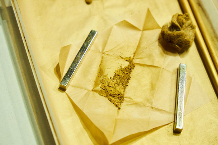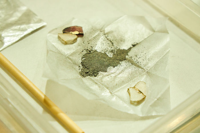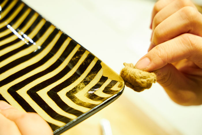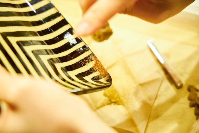 ③平皿の金粉を蒔く作業。真綿に金粉を付けて、真綿をポンポンと叩いて金粉を振る。真綿で優しくなでたら磨き、1週間ほど乾かす。水洗いをして完成だ。