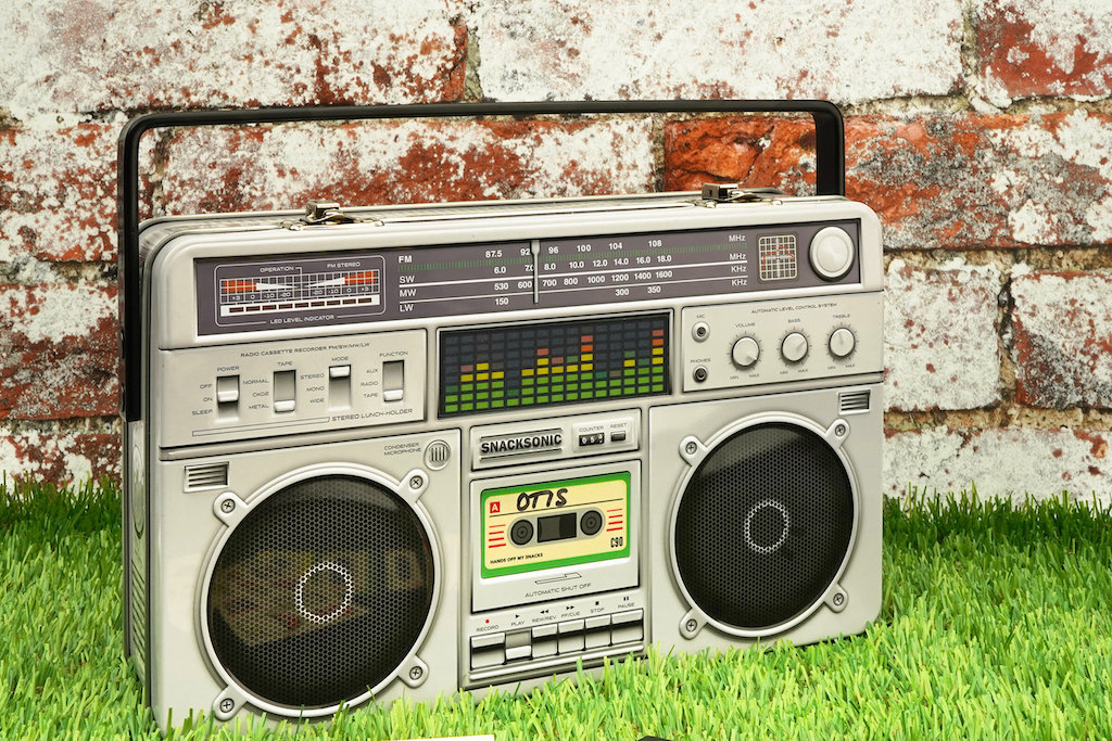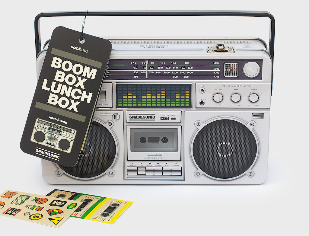 1980~90年代のストリートシーンを思わせるラジカセデザインのランチボックス。ヒップホップなコーディネイトのアクセントにもなる。カバンの中に入れておくにはもったいない。これは裸で携帯するのがクール。3980円 サイズ:77x188x263mm、重量:0.6Kg