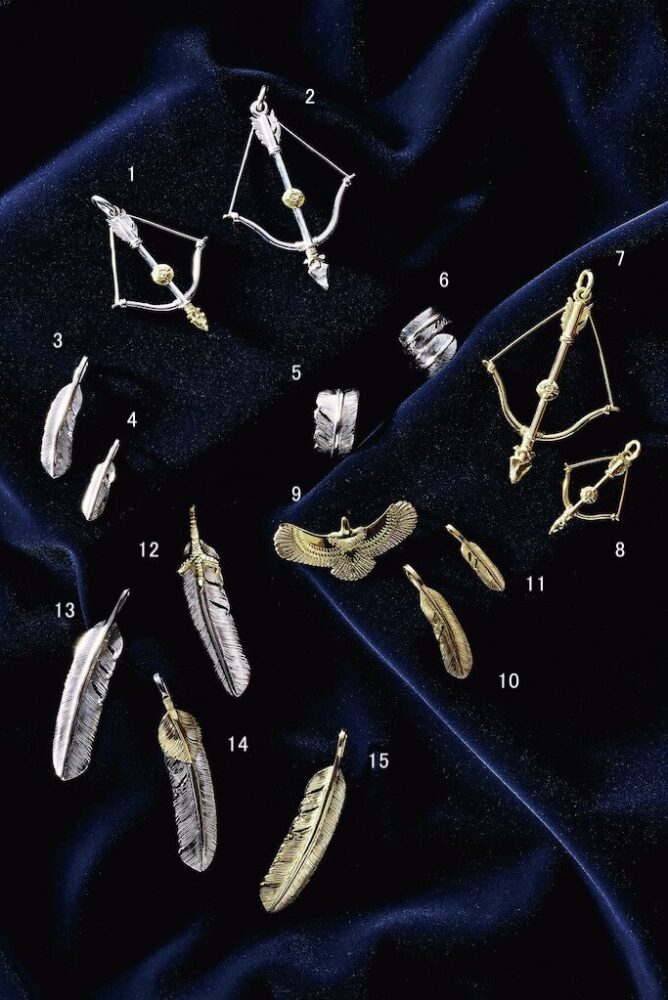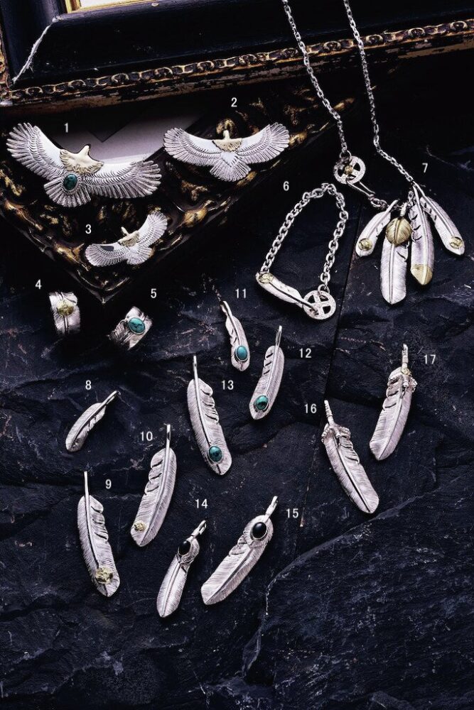 ネイティブスタイルを代表するイーグル&フェザー。数多くのブランドが手がける定番モチーフながら、熟練の職人技によって羽根の1本1本を丹念に掘り込まれた細密で躍動感あふれる仕上がりは、唯一無二で圧倒的な存在感を放つ。王道を行くならまずこちら。