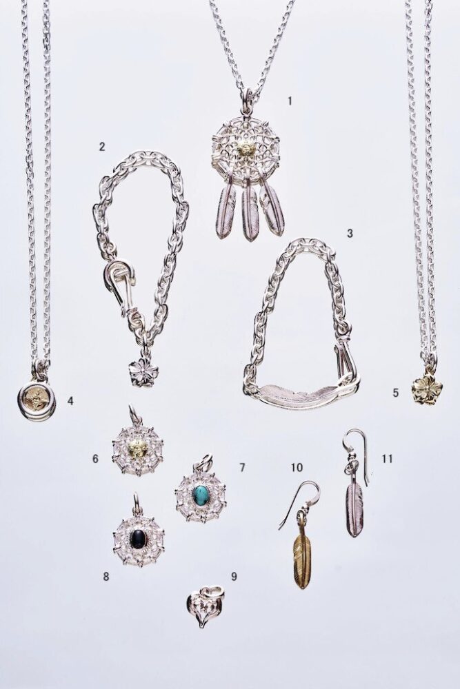 ネイティブ系のシルバージュエリーというと男性的なイメージが強いが、繊細な作りでエレガントな雰囲気が漂うファーストアローズ作品には、フラワーやドリームキャッチャーなど女性にも似合うモチーフも数多い。最愛のパートナーへの贈り物としても最適だ。