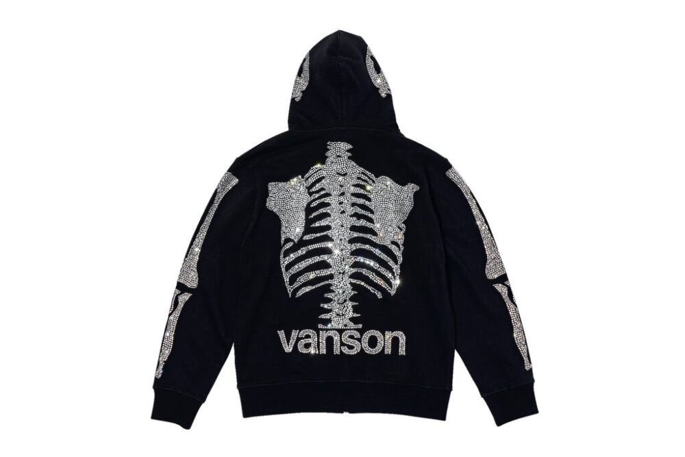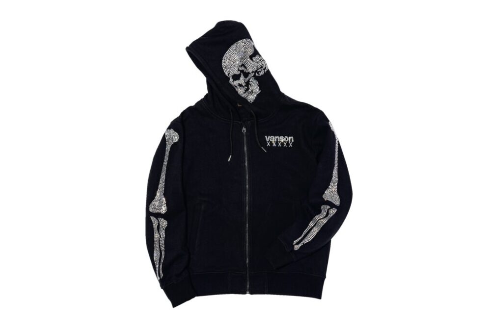 光を浴びると煌びやかに輝くラインストーンを使い、バンソンの定番であるスカル&ボーンのモチーフを裏毛起毛が施されたパーカーにデコレーション。華やかさと無骨さという相反する要素を巧みにミックスしている意欲作だ。